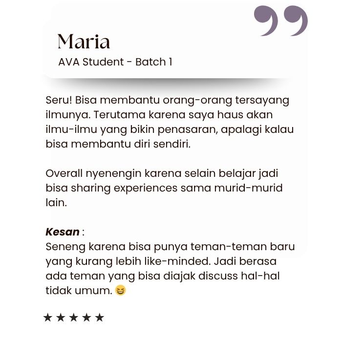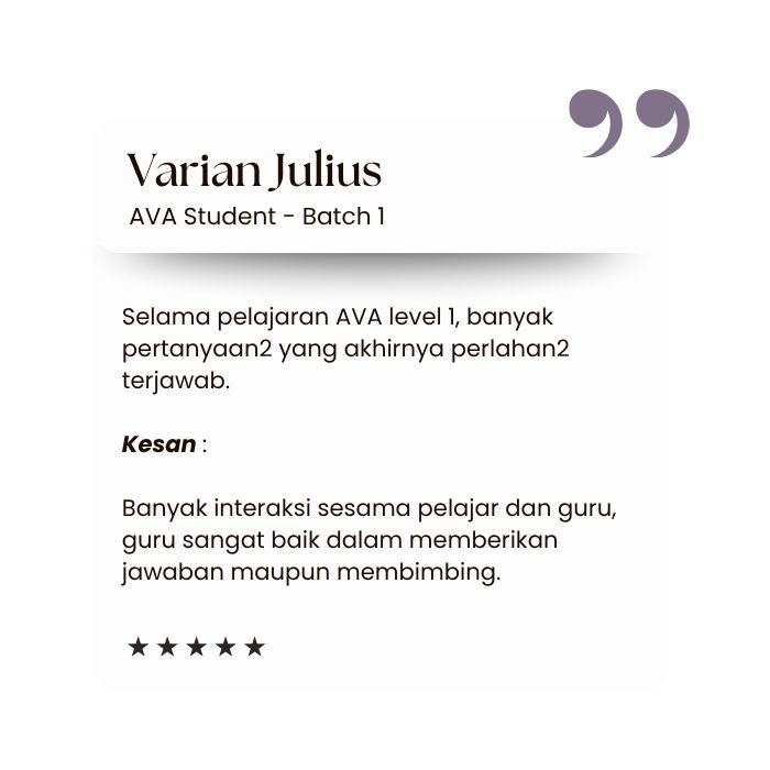 Sangat bersyukur berada di AVA mendapatkan ilmu yang sangat oke, guru yang bijaksana dan ilmunya tidak perlu diragukan serta teman teman belajar yang menyenangkan sehingga bisa upgrade diri.